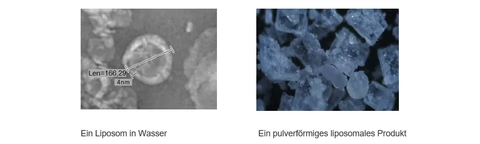图片显示了差异:水中脂质体因水压而呈现完美的球形。而脂质体粉末的图像则仅由干燥的磷脂和活性成分组成。与完整脂质体相比,粉末配方在水中的生物利用度要差得多。